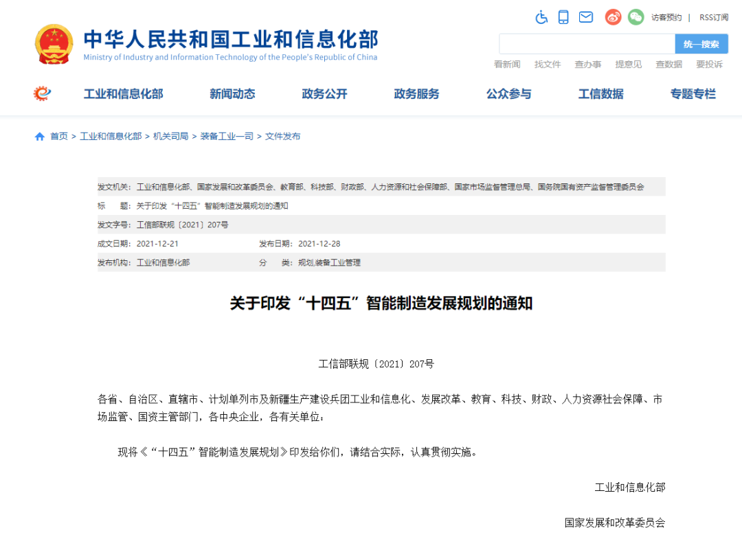 近日,工业和信息化部、国家发展和改革委员会、教育部、科技部、财政部、人力资源和社会保障部、国家市场监督管理总局、国务院国有资产监督管理委员会等八部门联合发布了《“十四五”智能制造发展规划》(以下简称《规划》)。