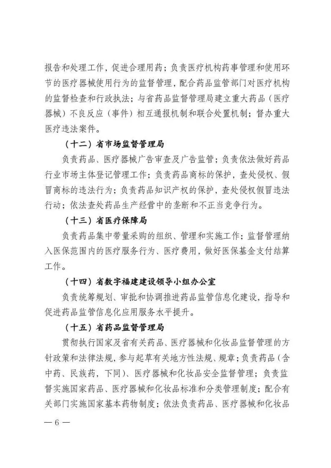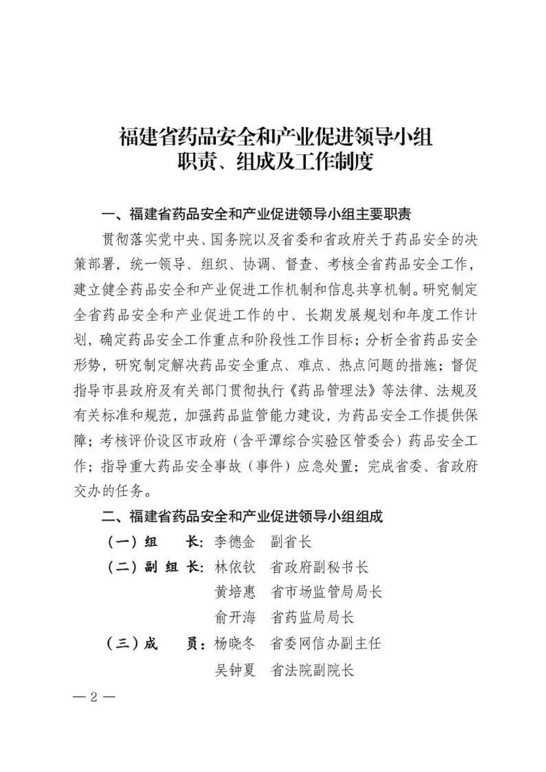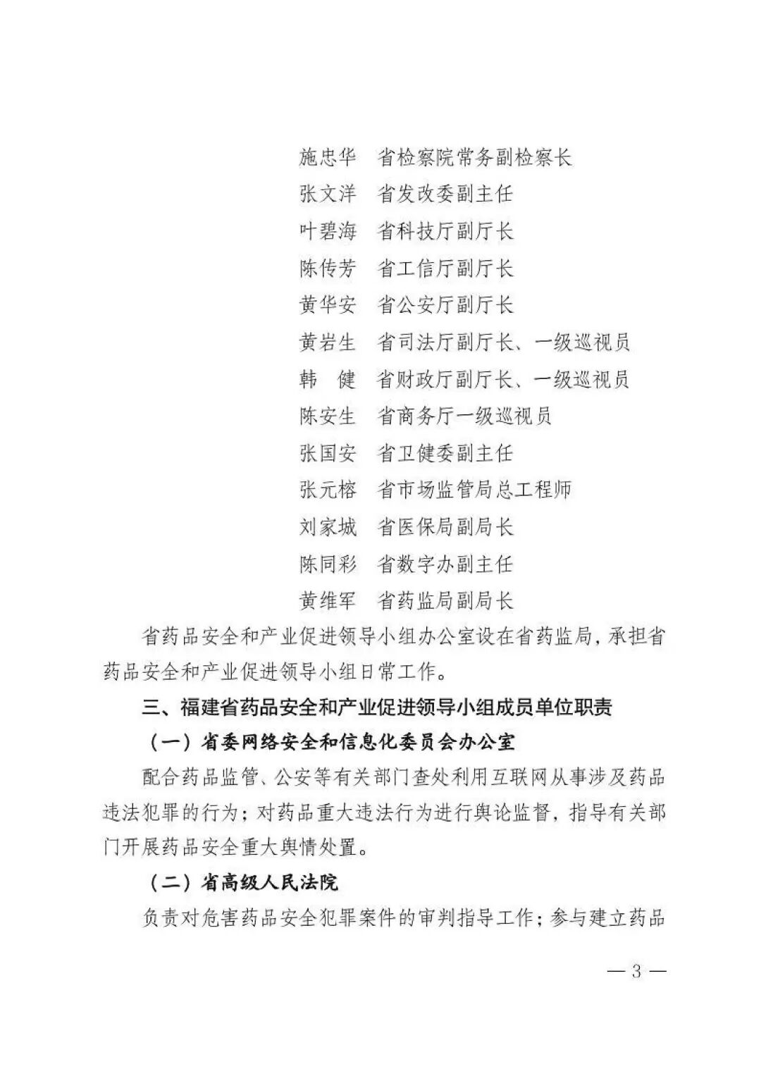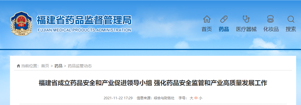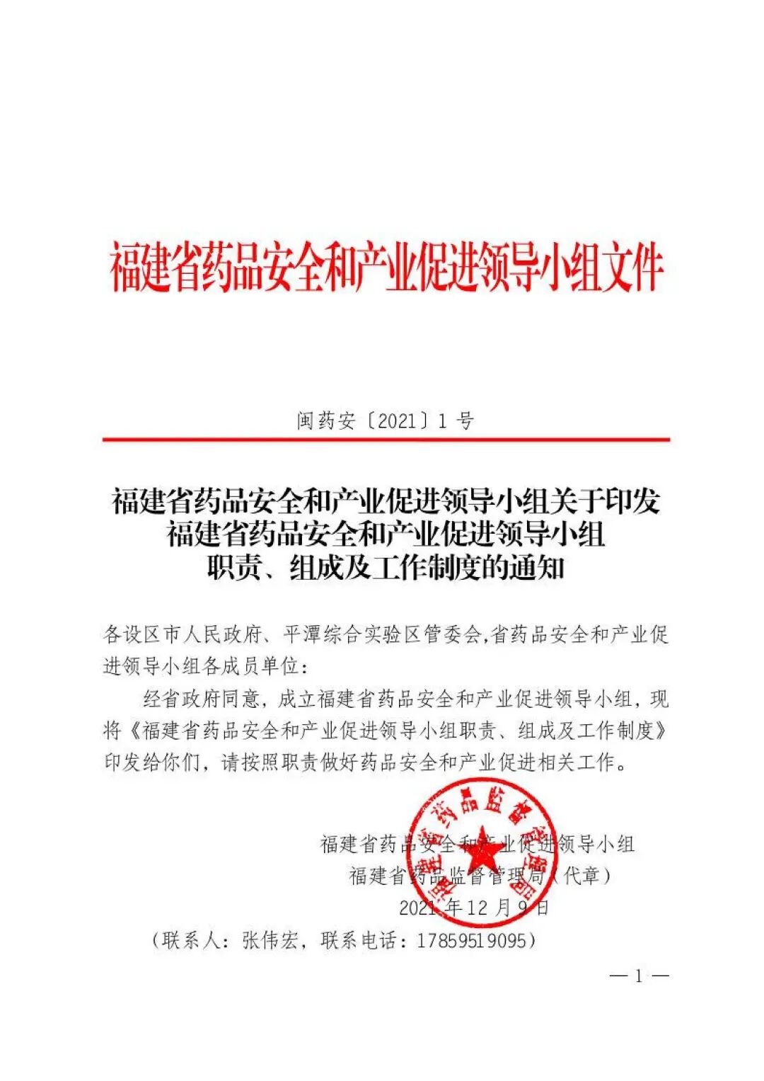 11月8日,经省政府同意,福建省药品安全和产业促进领导小组正式成立。省药品安全和产业促进领导小组组长由省政府分管领导担任,副组长由省政府副秘书长(省政府办公厅副主任)、省市场监管局局长、省药监局局长担任,成员单位包括省委网信办,省法院、省检察院,省发改委、省科技厅、省工信厅、省公安厅、省司法厅、省财政厅、省商务厅、省卫健委、省市场监管局、省医保局、省数字办、省药监局等15家单位。省药品安全和产业促进领导小组下设办公室,办公室设在省药监局,承担省药品安全和产业促进领导小组日常工作。