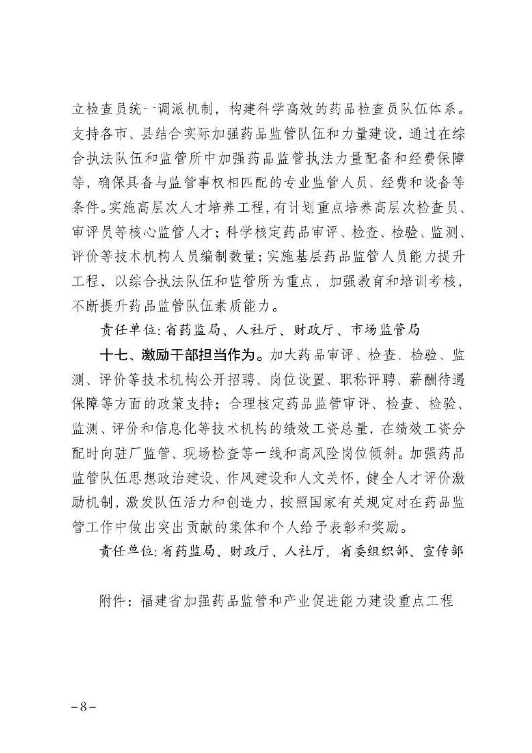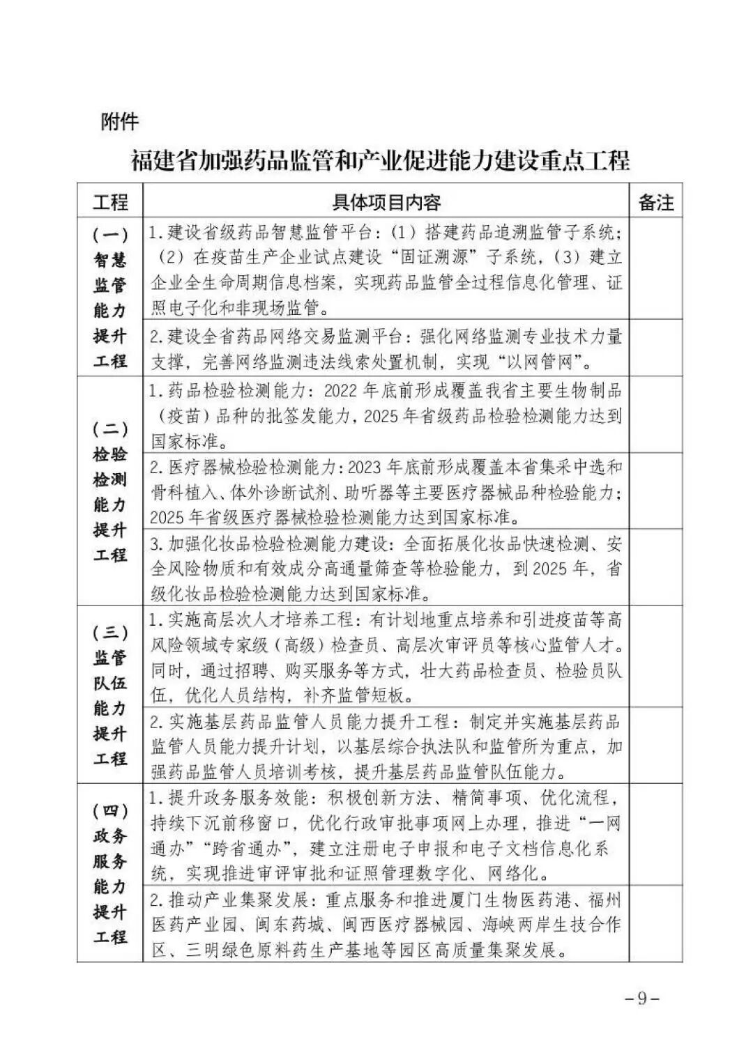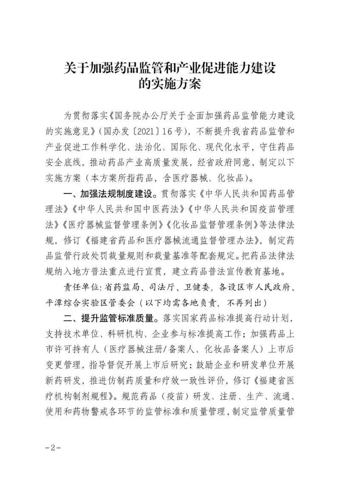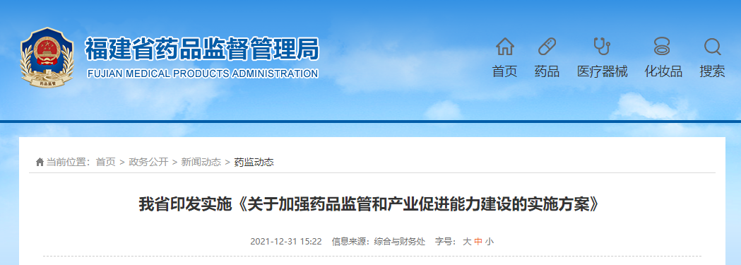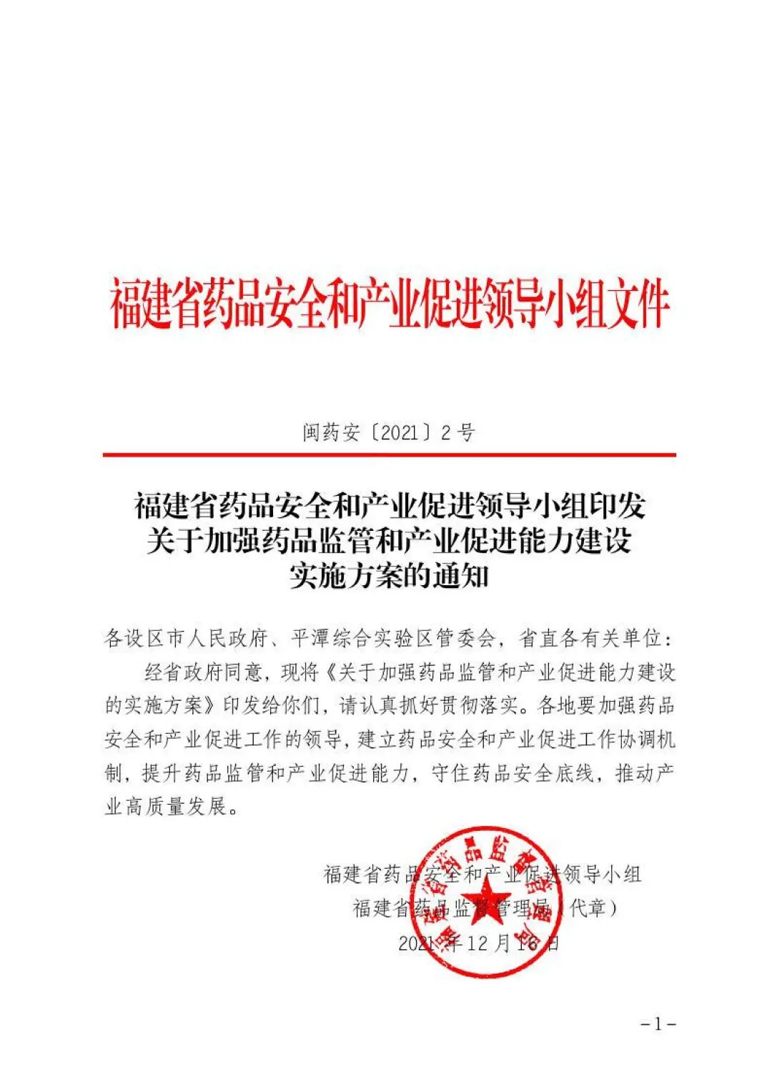 12月16日,经省政府批准,省药品安全和产业促进领导小组印发《关于加强药品监管和产业促进能力建设的实施方案》(闽药安〔2021〕2号,以下简称《实施方案》),全面提升药品监管和产业促进能力。