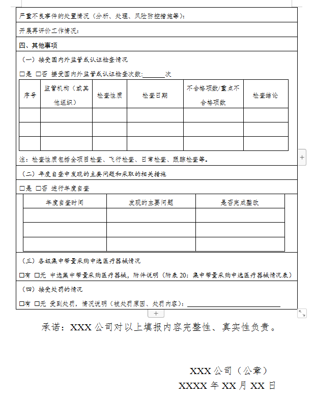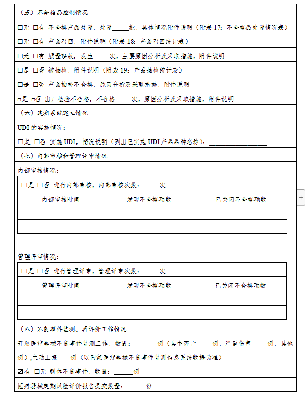 (五)XXXX年度医疗器械质量管理体系自查报告的填报内容为当年度1月1日至12月31日统计数据,应于次年1月31日之前向对应的药品监管部门提交。