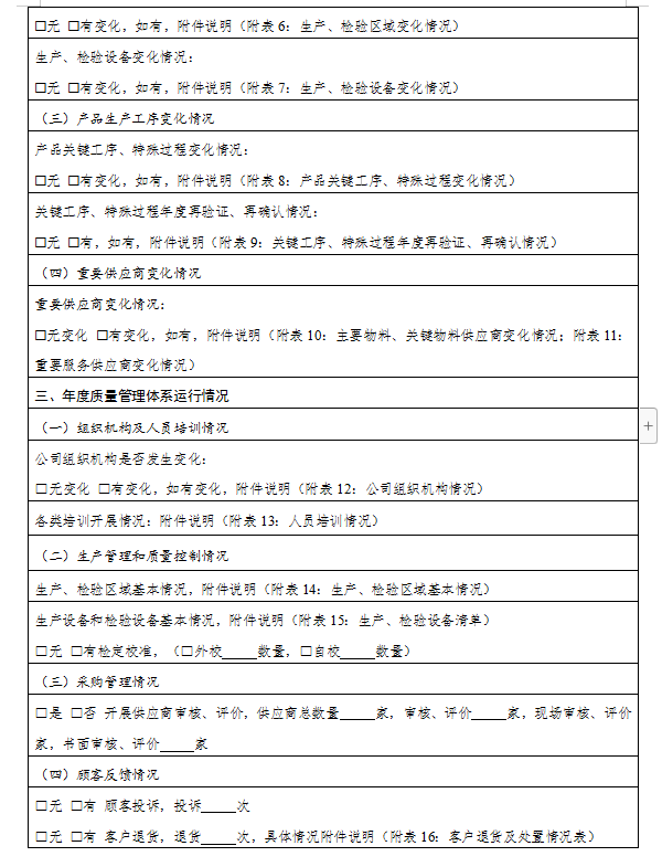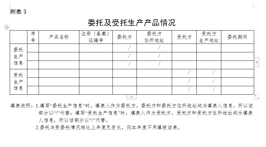 (三)修订之后的首次填报,不同类型填报主体按照上述填报内容进行填报。后期填报,对境内注册人、备案人、受托生产企业若无新增或减少的委托生产或受托生产情况且相关协议无变更的,则“委托生产基本情况”仅填报“委托方履行对受托企业的质量管理职责(或受托方接受委托人的质量管理)情况”。“三、年度质量管理体系运行情况”中“(二)生产管理和质量控制情况”中“生产、检验区域基本情况”“生产设备和检验设备清单”后期不用填报,无变化则不填报的内容参考每项填表说明。