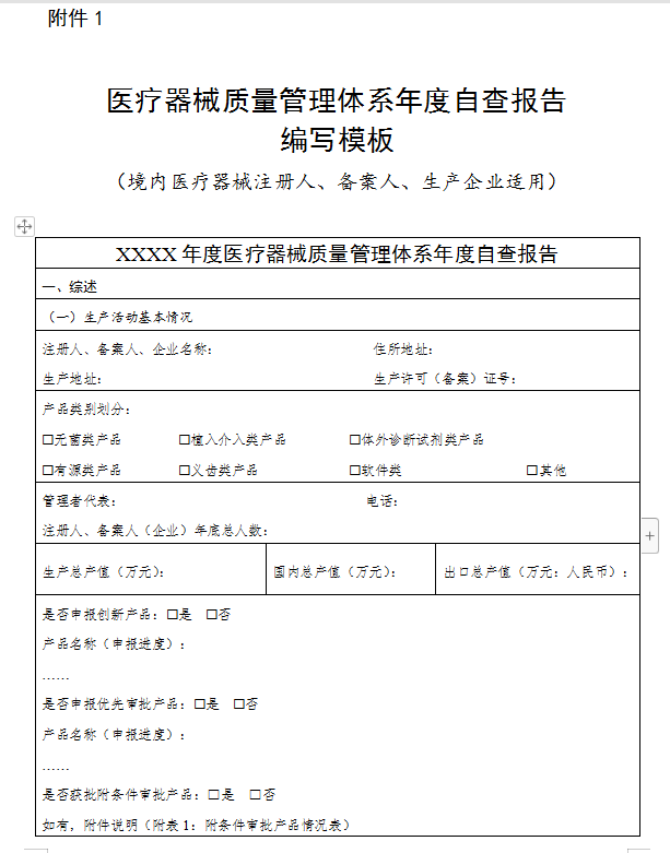 医疗器械质量管理体系年度自查报告编写模板(境内医疗器械注册人、备案人、生产企业适用)