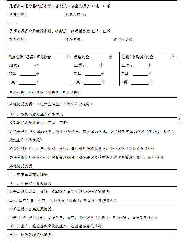 (一)境内医疗器械注册人、备案人填报内容仅涉及在中国大陆地区注册上市医疗器械产品。“二、年度重要变更情况”全部及“三、年度质量管理体系运行情况”中的“顾客反馈情况”“不良事件监测、再评价工作情况”“追溯系统建立情况”部分内容仅由注册人、备案人填报相关情况,受托生产企业不填写其接受委托生产产品的上述情况。无生产能力的医疗器械注册人、备案人,相关内容填报受托方的相关情况。如果有多于两家的受托方,对于“三、年度质量管理体系运行情况”需要分别填写并以“三、年度质量管理体系运行情况(受托方1:XXX)”进行区别。既具备生产能力也存在委托或者受托生产情况的注册人、备案人,提交所有要求内容,对于“三、年度质量管理体系运行情况”涉及的注册人、备案人以及受托方需要分别填写并以“三、年度质量管理体系运行情况(注册人、备案人)”“三、年度质量管理体系运行情况(受托方1:XXX)”进行区别;对于“二、年度重要变更情况”包含注册人、备案人自己生产及委托生产所有产品相关变更情况。