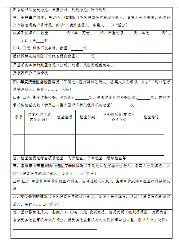 (四)进口医疗器械注册人、备案人由其指定的境内代理人向代理人所在省级药品监督管理部门提交自查报告,包含进口医疗器械注册产品、销售情况、上市后管理、不良事件监测、再评价、接受检查以及接受处罚情况等。如代理人同时代理多个不同进口医疗器械注册人、备案人,其自查报告应包含其代理的所有进口医疗器械注册人、备案人的产品,部分内容应按要求分别填写。