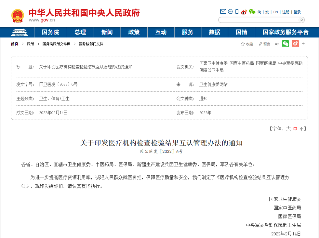 检查检验是医疗服务中的一项重要内容,实现不同医疗机构间的检查检验结果互认,有助于提高医疗资源的利用率,降低医疗费用,提高诊疗效率,进一步改善人民群众就医体验。为做好相关工作,国家卫生健康委、国家医保局、国家中医药局、中央军委后勤保障部卫生局联合印发了《医疗机构检查检验结果互认管理办法》(以下简称《管理办法》)。