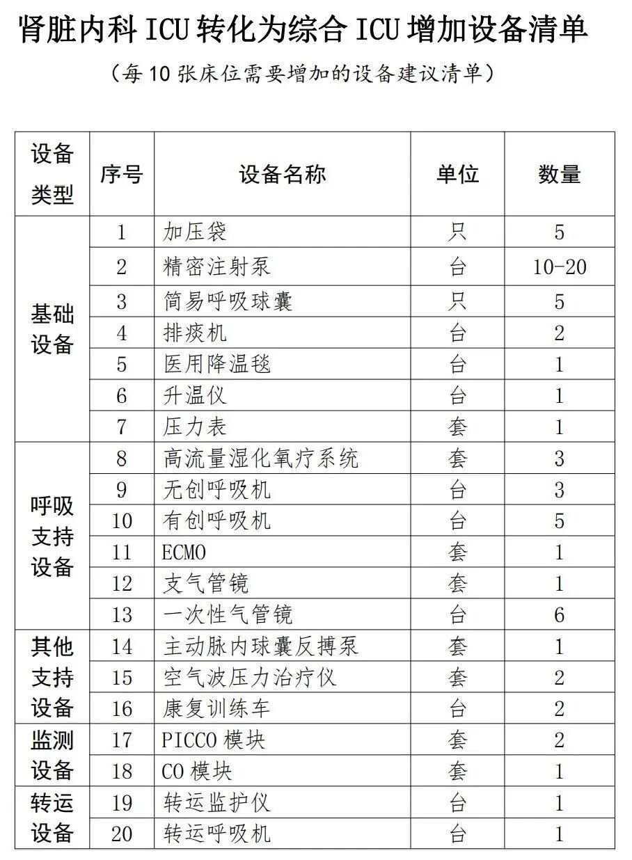 《重症床位扩容改造操作指南》中还指出,要迅速改造其他专科ICU床位。医院立即启动除综合ICU外,其他专科重症监护床位扩容改造工作。按照综合ICU标准,对其供电、供氧系统进行改造,配备呼吸机、监护仪等满足综合重症救治需要的监护与治疗设备,确保需要时,随时可投入新型冠状病毒感染重症患者医疗救治。